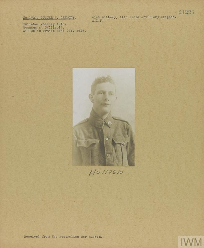 Gunner Walter Carmody 1727. Unit: 41st Battery, 11th Field Artillery Brigade, Australian Imperial Force. Death: 22 July 1917 Killed in action Western Front