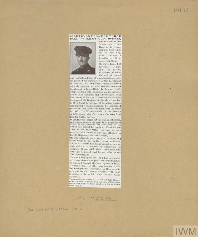 Lieutenant Samuel Tudor Barr. Unit: 3rd (King's Own) Hussars, attached to 20th Hussars. Death: 23 February 1915 Rouen Western Front
