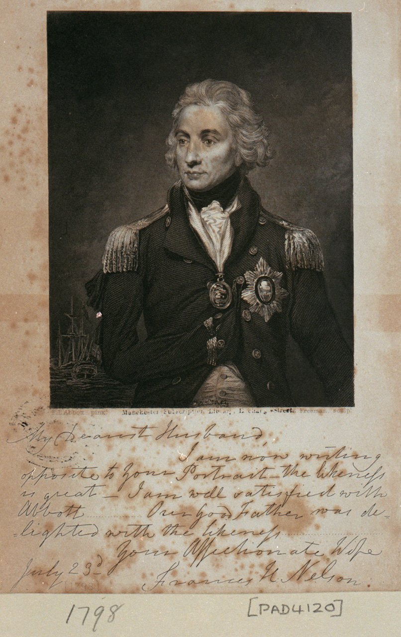 My Dearest Husband, I am now writing opposite to your Portrait the likeness is great - I am well satisfied with Abbott.... Our Good Father was delighted with the likeness. Your affectionate Wife Frances H Nelson. July 23rd [1798]. Mounted with PAD4121-PAD