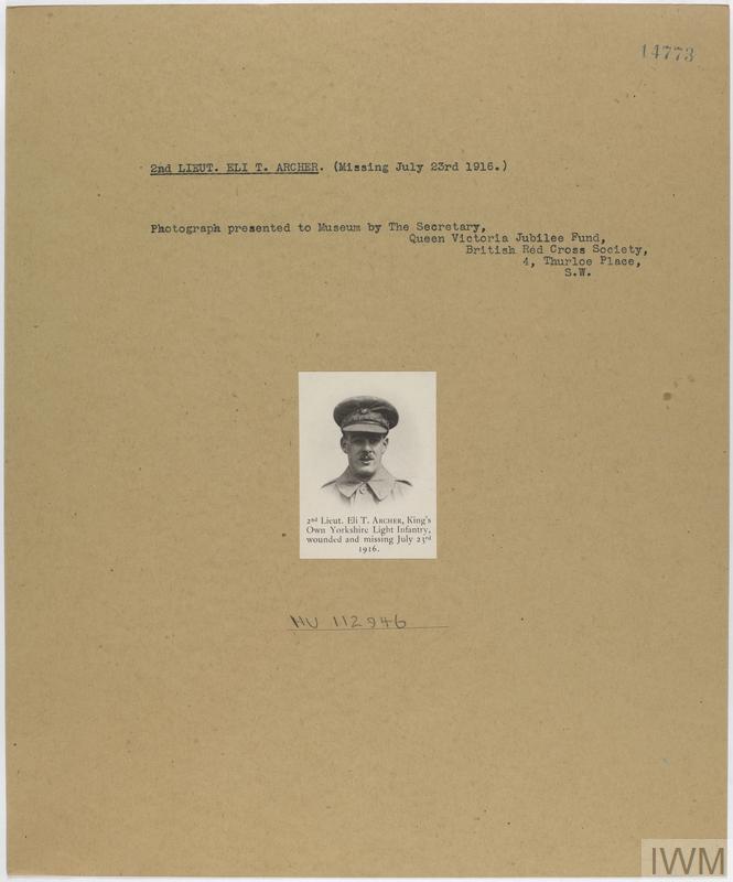 Second Lieutenant Eli Townend Archer. Unit: 1st/4th Battalion, King's Own Yorkshire Light Infantry. Death: 23 July 1916, Somme, Western Front. Commemorated on the Thiepval Memorial.