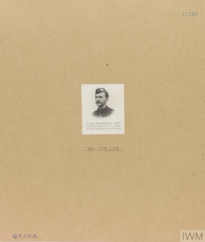 Sergeant David Grant Bremner 24986. Unit: "D" Company, 2nd Battalion, Royal Scots. Death: 23 July 1916, Somme, Western Front. Commemorated on the Thiepval Memorial.