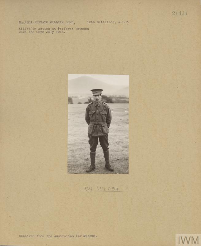 Private William Bond 2901. Unit: 12th Battalion, Australian Infantry, Australian Imperial Force. Death: 23 July 1916, Pozieres, Somme, Western Front.