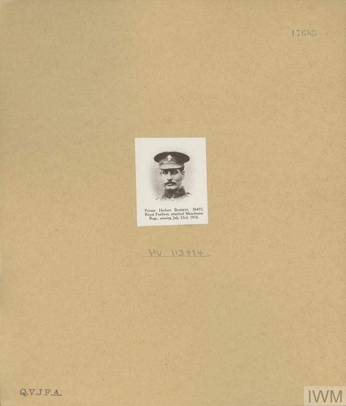 Private Herbert Blissett 34655. Unit: 8th Battalion, Royal Fusiliers, attached to the Manchester Regiment. Death: 23 July 1916, Somme, Western Front. Commemorated on the Thiepval Memorial.