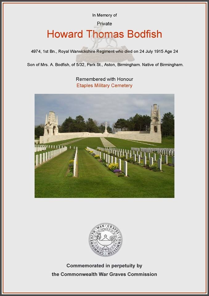 Private Howard Thomas Bodfish 4974, Royal Warwickshire Regiment