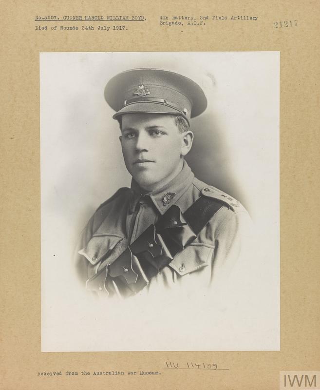 Gunner Harold William Boyd 5207. Unit: 4th Battery, 2nd Field Artillery Brigade, Australian Imperial Force. Death: 24 July 1917