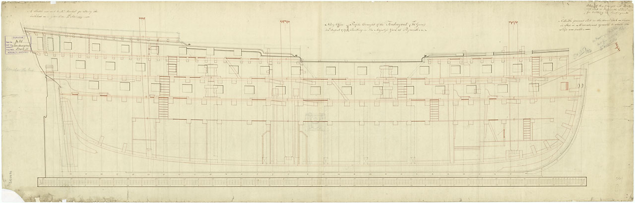 Foudroyant (1798). Scale: 1:48. Plan showing the inboard profile for Foudroyant (1798), an 80-gun Third Rate, two-decker, building at Plymouth Dockyard. A copy of this with the deck plans was sent to Plymouth Dockyard on 14 January 1790. The pencil altera