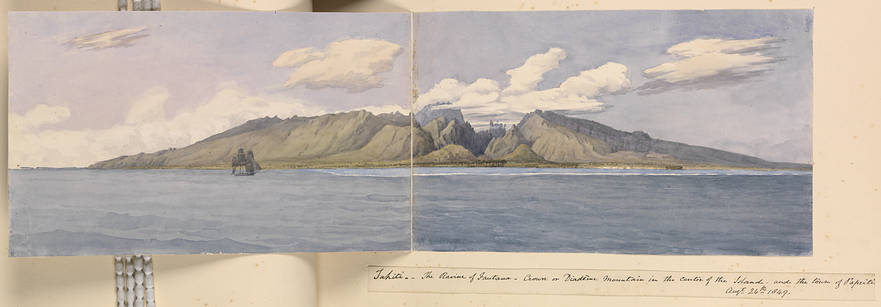 'Tahiti [Society Islands]. The Ravine of Fautaua - Crown or Diademe Mountain in the centre of the Island, and the town of Papeiti, Augt 24th 1849'. No. 13 in Fanshawe's Pacific album, 1849 - 52. A fold-out panoramic drawing of Tahiti, on tw