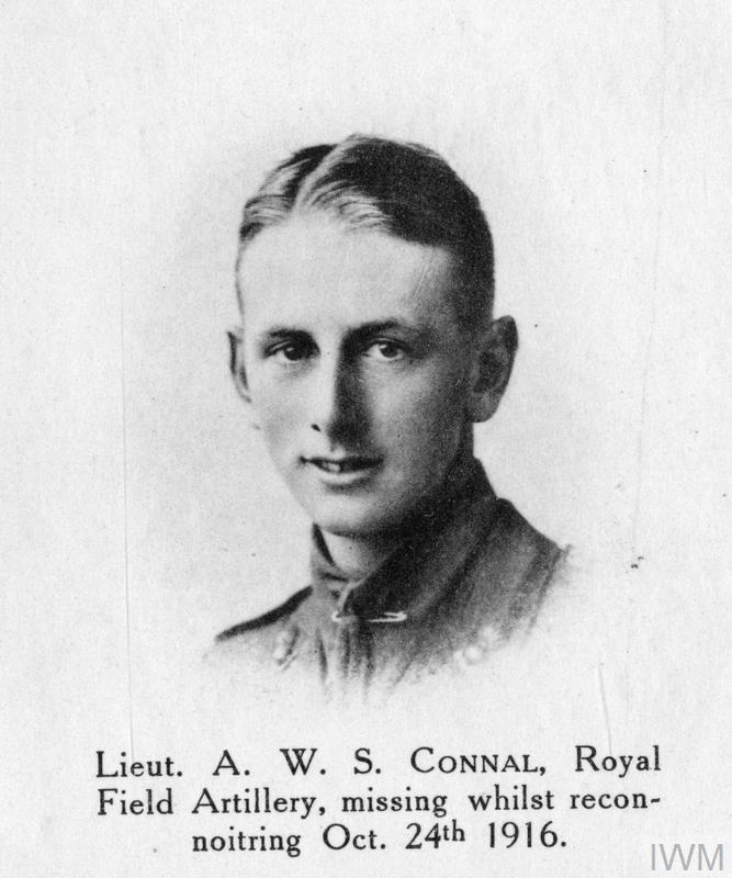 Lieutenant Arthur Willam Campbell Connal. Unit: 53rd Battery, 38th Brigade, Royal Field Artillery. Death: 24 October 1916, missing, Somme, Western Front. Commemorated on the Thiepval Memorial.