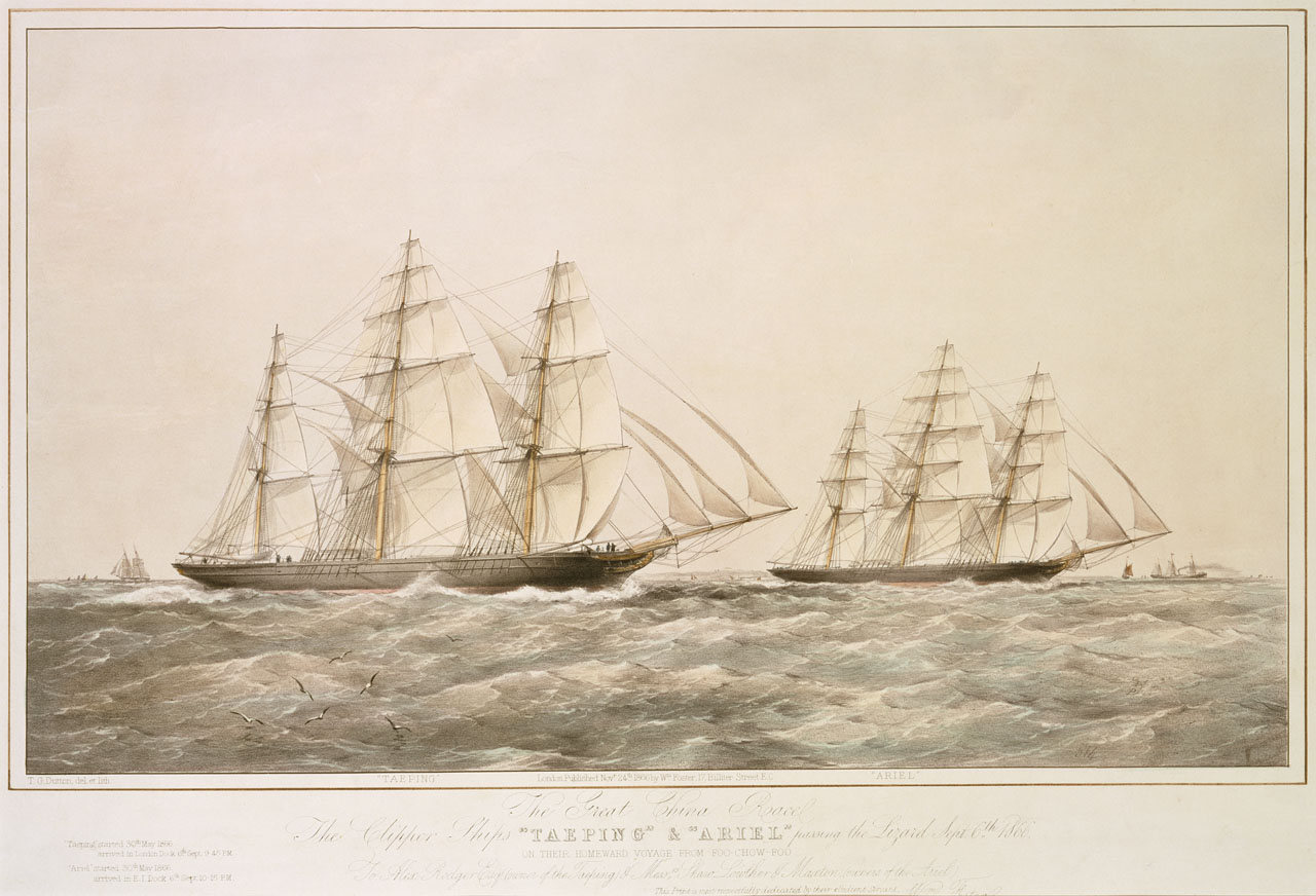 The Great China Race. The Clipper Ships Taeping & Ariel passing the Lizard Sept 6th 1866 on their homeward voyage from Foo-Chow-Foo. Hand-coloured. 'Taeping' had set off from China with a cargo of tea on 30 May 1866 and arrived at London Doc