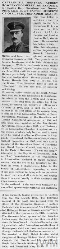 Captain Montagu Aubrey Rowley Cholmeley. Unit: 2nd Battalion, Grenadier Guards. Death: 24 December 1914 Killed in action aged 38 years La Bassee, Western Front. 4th Bart. Husband of Mabel Janetta Cholmeley, of Easton Hall, Grantham.