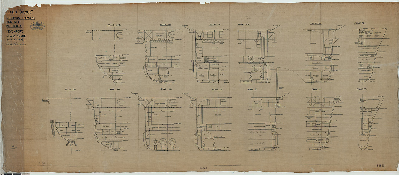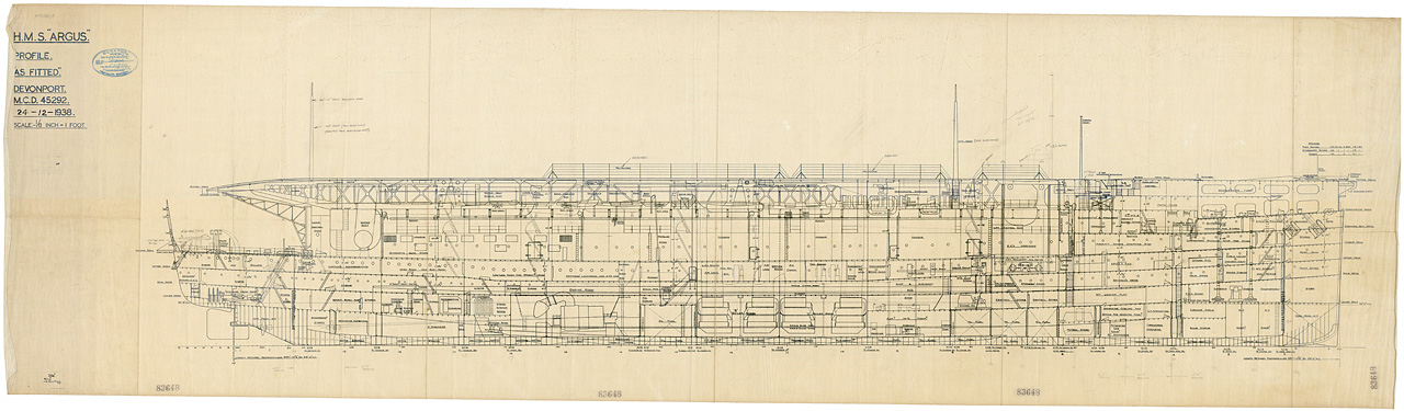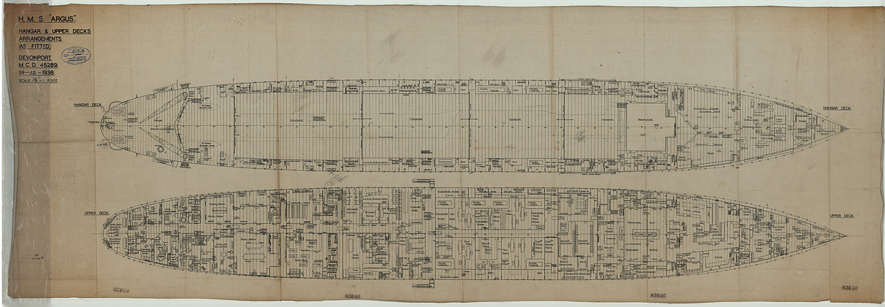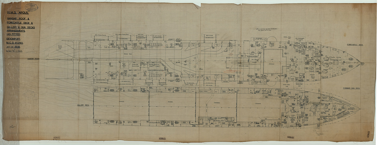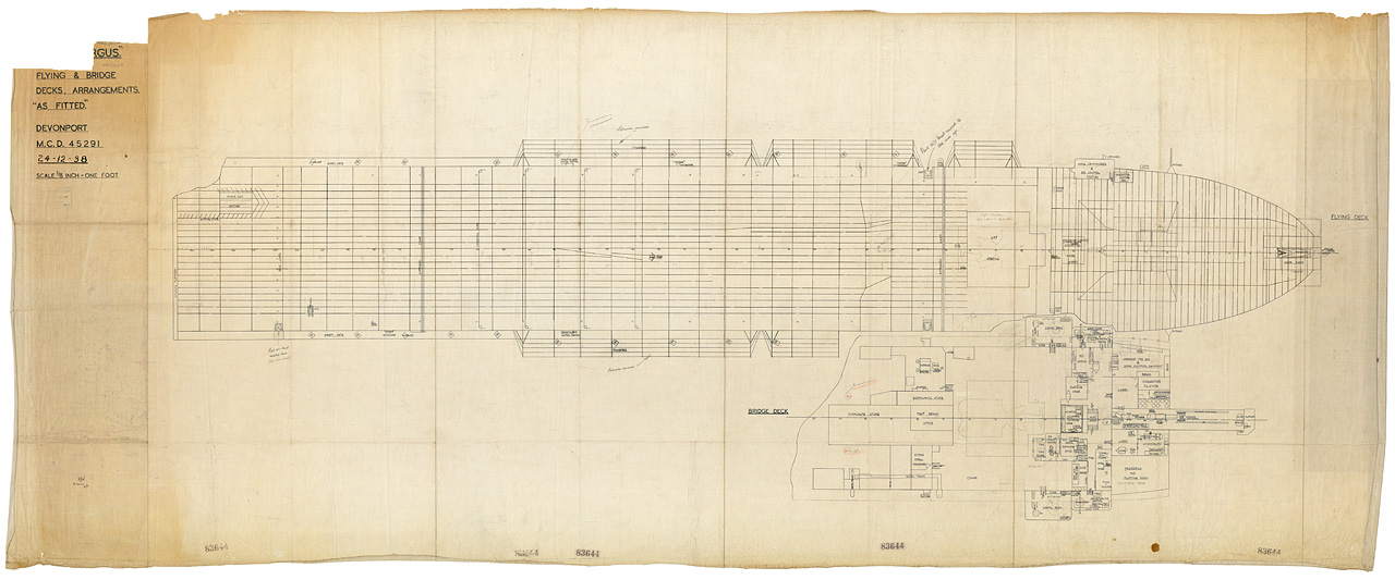Argus (1917). Scale 1:96. A plan showing the flight and bridge decks of the aircraft carrier HMS Argus (1917), illustrating her appearance as of 1938.