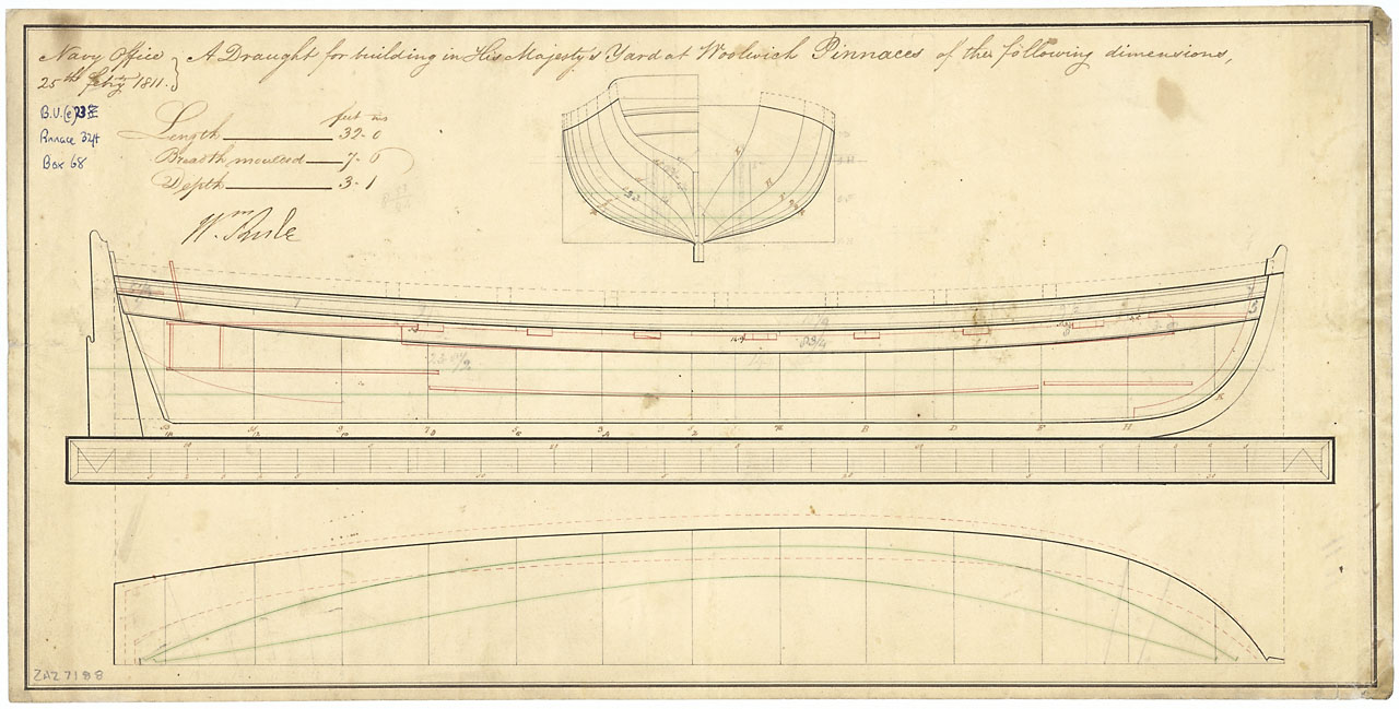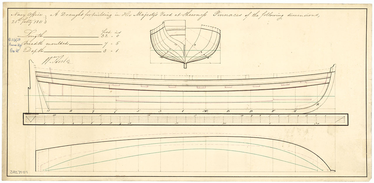 32 ft Pinnace. Scale: 1:24. Plan showing the body plan, sheer lines with inboard detail, and longitudinal half-breadth for a 14 oared, 32 ft Pinnace to be built at Sheerness Dockyard. Signed William Rule [Surveyor of the Navy, 1793-1813].