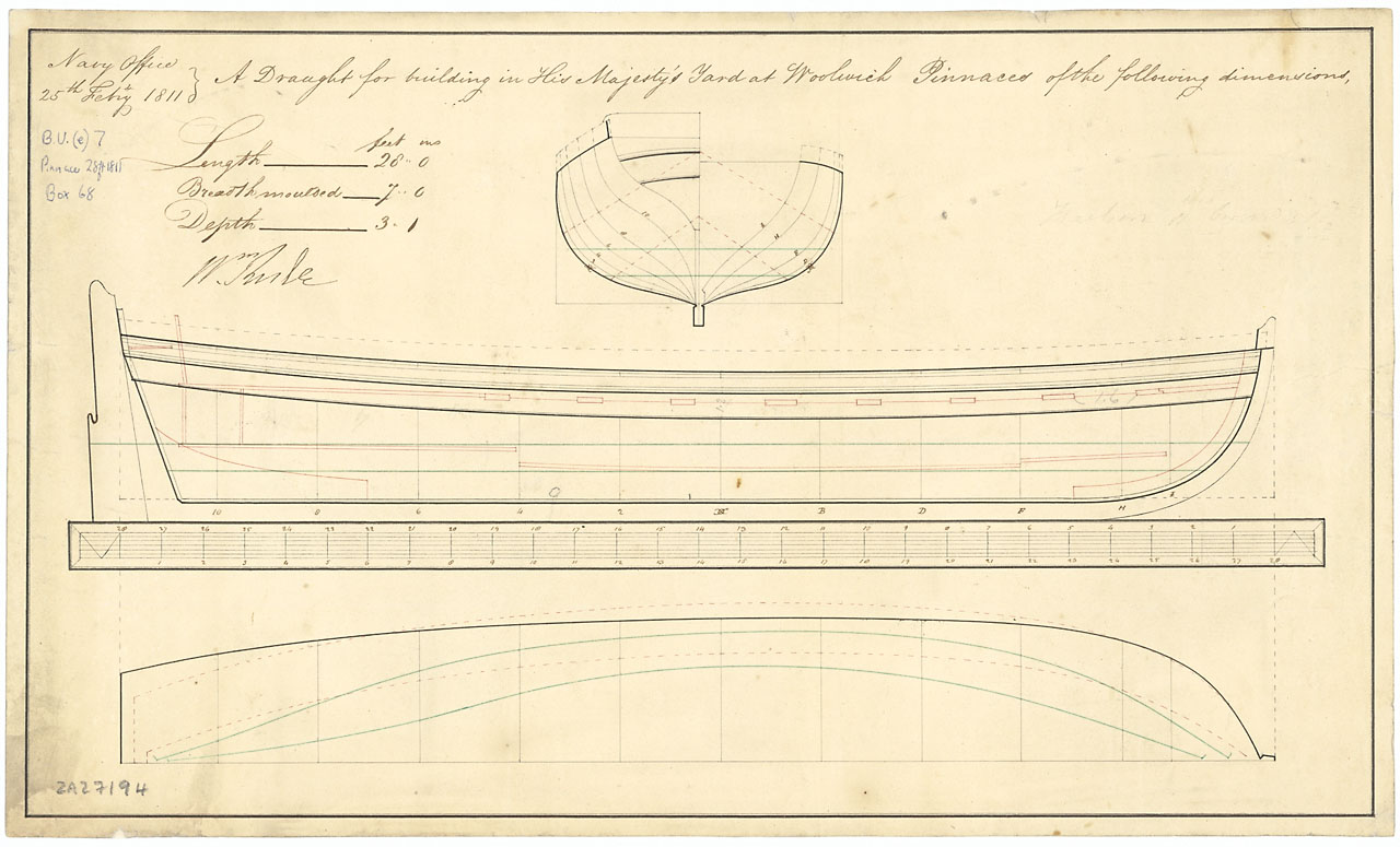 32 ft Pinnace. Scale: 1:24. Plan showing the body plan, sheer lines with inboard detail, and longitudinal half-breadth for a 14 oared, 32 ft Pinnace to be built at Woolwich Dockyard. Signed William Rule [Surveyor of the Navy, 1793-1813].
