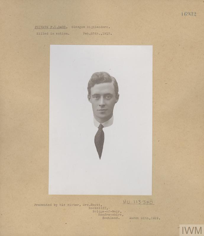 Private Frederick Train Barr 2766. Unit: 9th (Glasgow Highlanders) Battalion, Highland Light Infantry. Death: 25 February 1915 Western Front. Son of James and Mary Barr. Native of Glasgow.