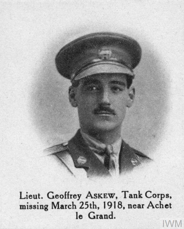 Lieutenant Geoffrey Askew MC. Unit: 10th Battalion, Tank Corps. Death: 25 March 1918 Missing near Achet le Grand Western Front
