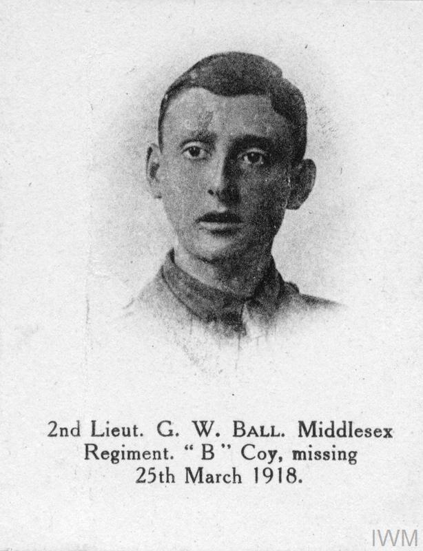 Second Lieutenant George William Ball. Unit: B Company, 2nd Battalion, Middlesex Regiment. Death: 25 March 1918