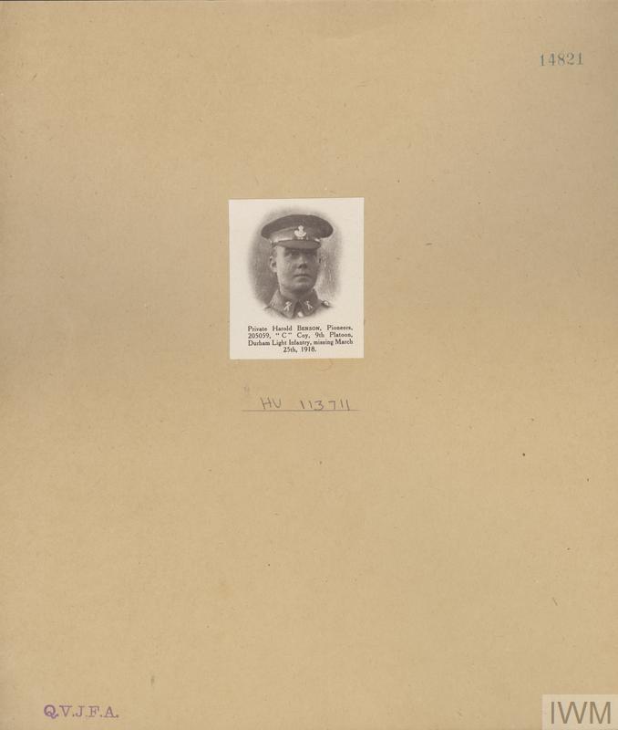 Private Harold Benson 205059. Unit: 9th Platoon, C Company, Durham Light Infantry. Death: 25 March 1918