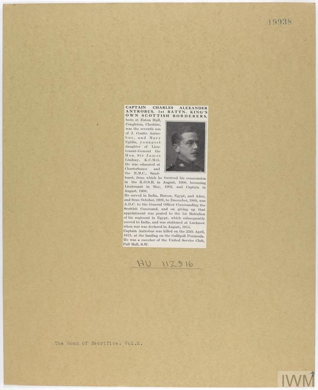 Captain Charles Alexander Antrobus. Unit: 1st Battalion, King's Own Scottish Borderers. Death: 25 April 1915 Gallipoli Dardanelles