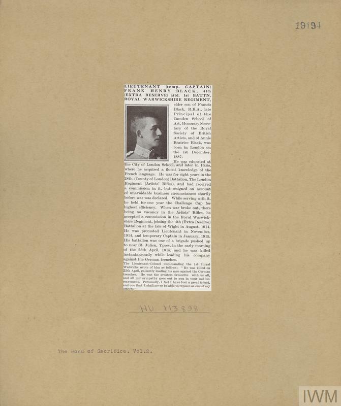 Lieutenant (Temporary Captain) Francis Henry Black. Unit: 4th Battalion, attached to 1st Battalion, Royal Warwickshire Regiment. Death: 25 April 1915 St Julien near Ypres Western Front