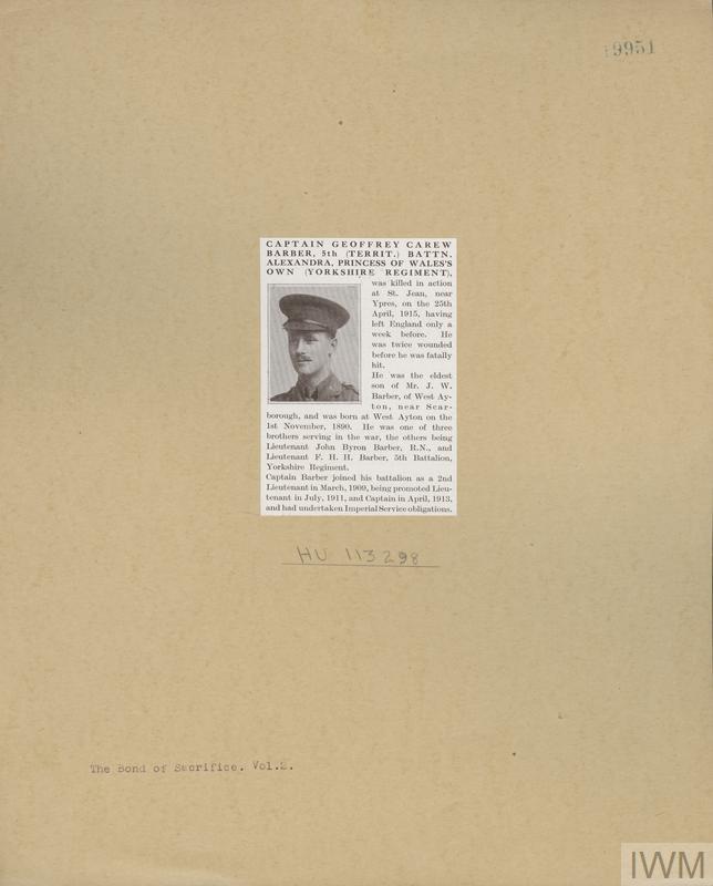 Captain Geoffrey Carew Barber. Unit: 5th Battalion, Yorkshire Regiment. Death: 25 April 1915 St Jean Western Front
