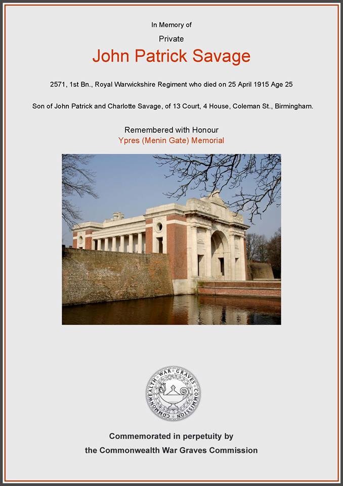 Private John Patrick Savage 2571, Royal Warwickshire Regiment