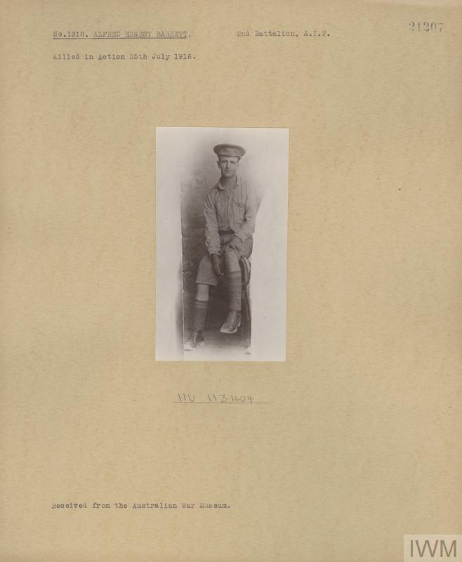 Private Alfred Ernest Barrett 1318. Unit: 2nd Battalion, Australian Imperial Force. Death: 25 July 1916, Western Front. Commemorated on the Villers-Bretonneux Memorial.