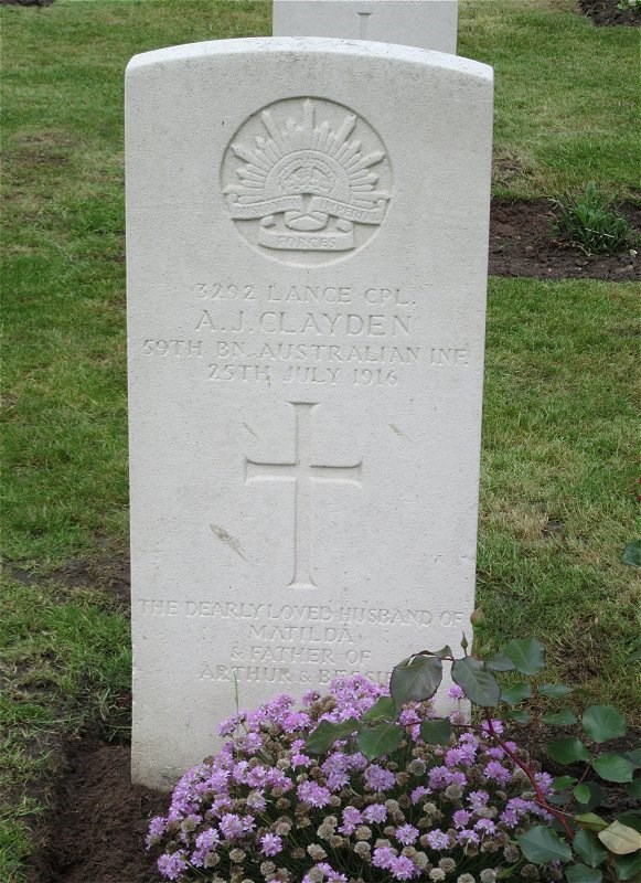 Lance Corporal Arthur James Clayden 3292. Unit: 7th Battalion, attached to 59th Battalion, Australian Imperial Force. Death: 25 July 1916 Wounded at Fleurbaix and died in Maida Vale Hospital London Western Front