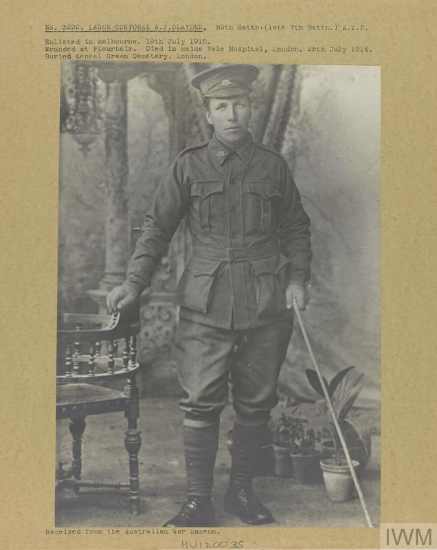 Lance Corporal Arthur James Clayden 3292. Unit: 7th Battalion, attached to 59th Battalion, Australian Imperial Force. Death: 25 July 1916 Wounded at Fleurbaix and died in Maida Vale Hospital London Western Front