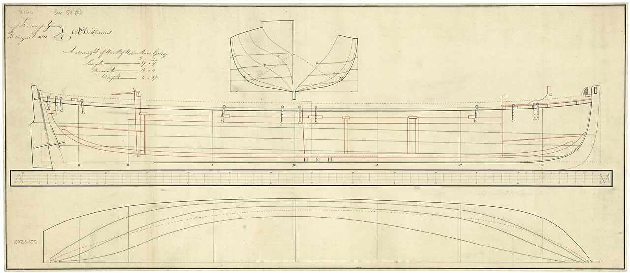 Prince of Wales (fl.1801). Scale: 1:32.  Plan showing the body plan, sheer lines with inboard detail, and longitudinal half-breadth for the Prince of Wales (fl.1801), a 67ft Rowing Galley.  She may have been a rowing gunboat.