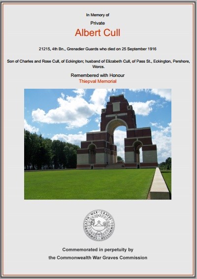 Private Albert Edward Whittingham 243. Unit: 16th Battalion, Royal Warwickshire Regiment. Death: 25 September 1916 Killed in Action Western Front