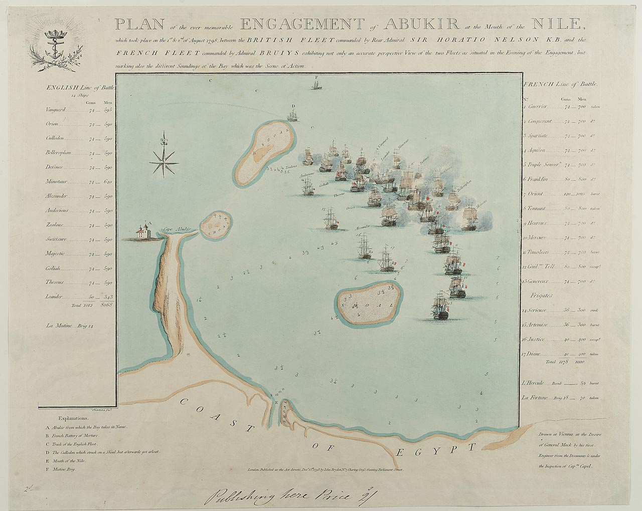 Plan of the... Engagement of Abukir at the Mouth of the Nile, ... on 1st & 2nd August 1798... as situated in the Evening.... Hand-coloured.
