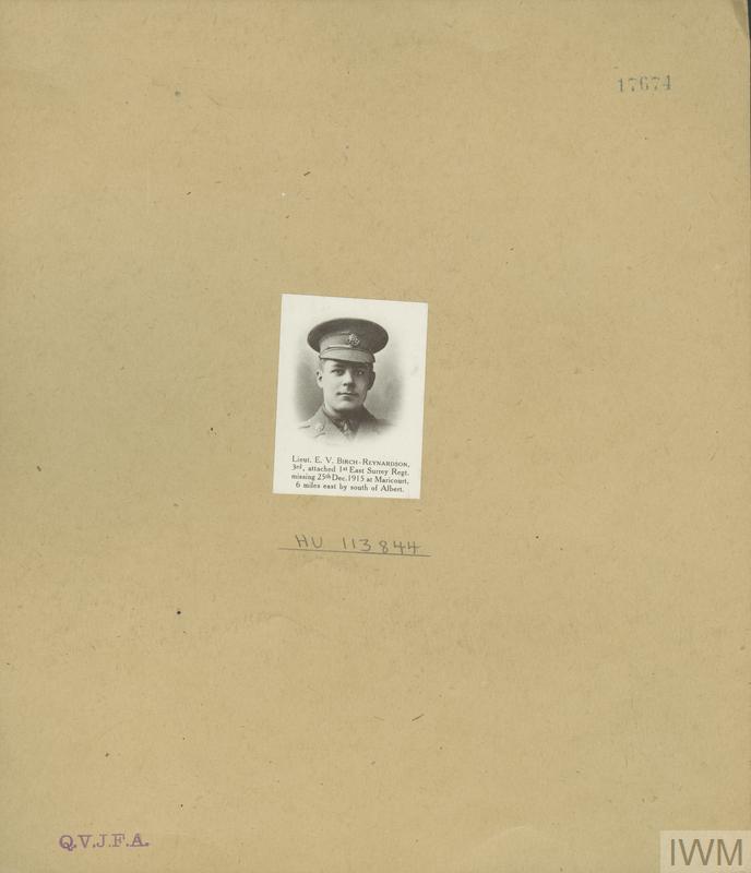Lieutenant Edward Vere Birch-Reynardson. Unit: 3rd Battalion, East Surrey Regiment, attached to 1st Battalion, East Surrey Regiment. Death: 25 December 1915
