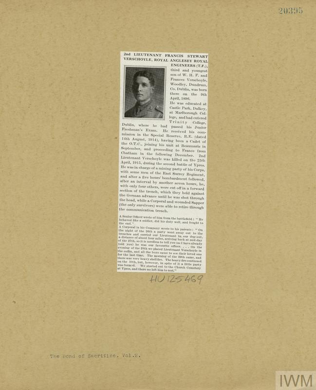 Second Lieutenant Francis Stewart Verschoyle. Unit: 2nd Siege Company, Royal Anglesey Royal Engineers (T.F.). Death: 25 April 1915 At Ypres Western Front