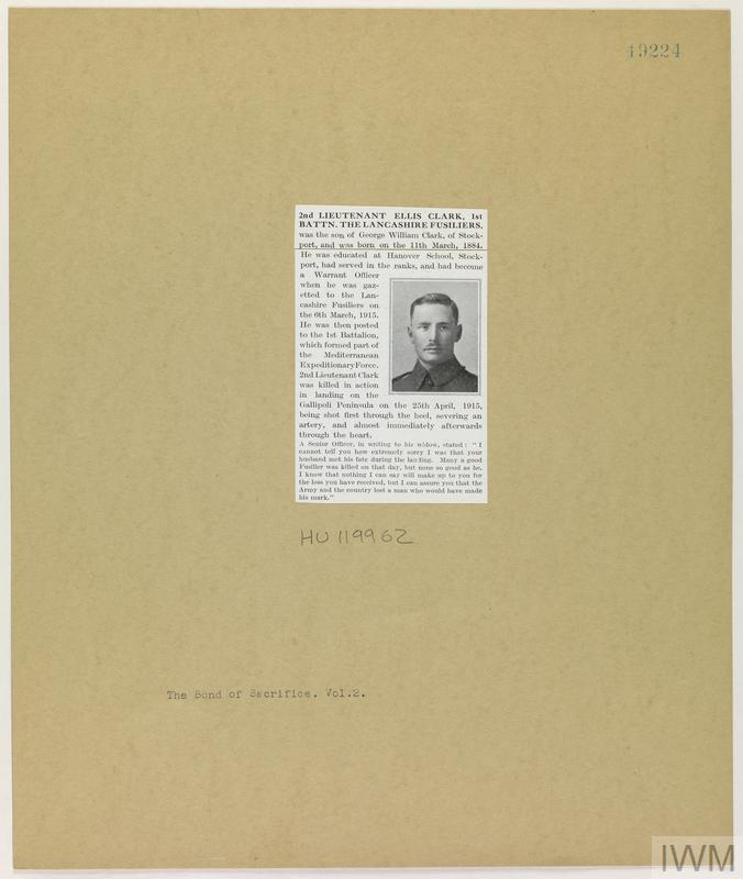 Second Lieutenant Ellis Clark. Unit: 1st Battalion, Lancashire Fusiliers. Death: 25 April 1915 Killed in action Gallipoli