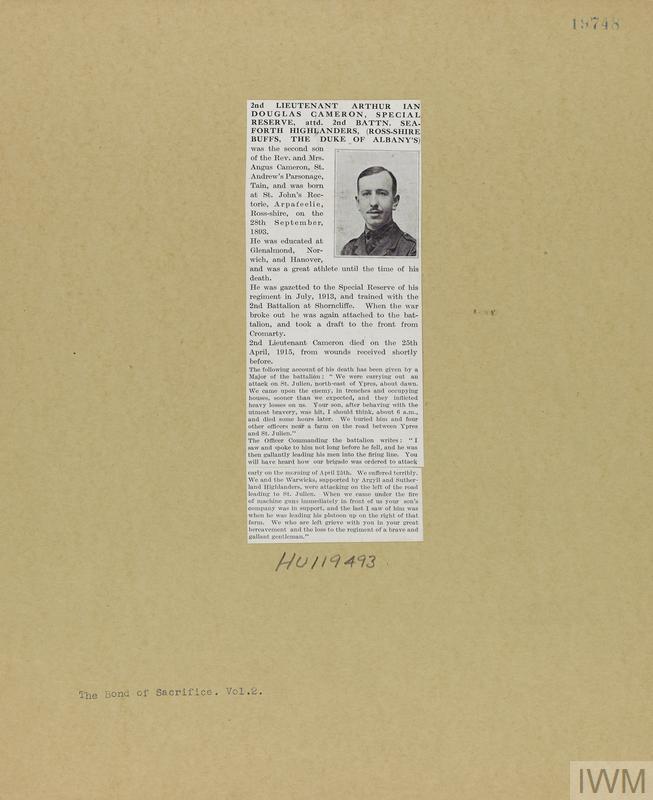 Second Lieutenant Arthur Ian Douglas Cameron. Unit: Special Reserve of Officers, attached to 2nd Battalion, Seaforth Highlanders. Death: 25 April 1915 Died of wounds at St Julien near Ypres Western Front