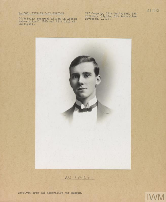 Private Jack Keith Bradley 289. Unit: B Company, 12th Battalion, 3rd Infantry Brigade, 1st Australian Division, Australian Infantry, Australian Imperial Force. Death: 25 April 1915 Gallipoli Dardanelles