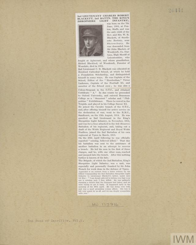 Second Lieutenant Charles Robert Blackett. Unit: 2nd Battalion, King's Shropshire Light Infantry. Death: 25 April 1915 Ypres Western Front