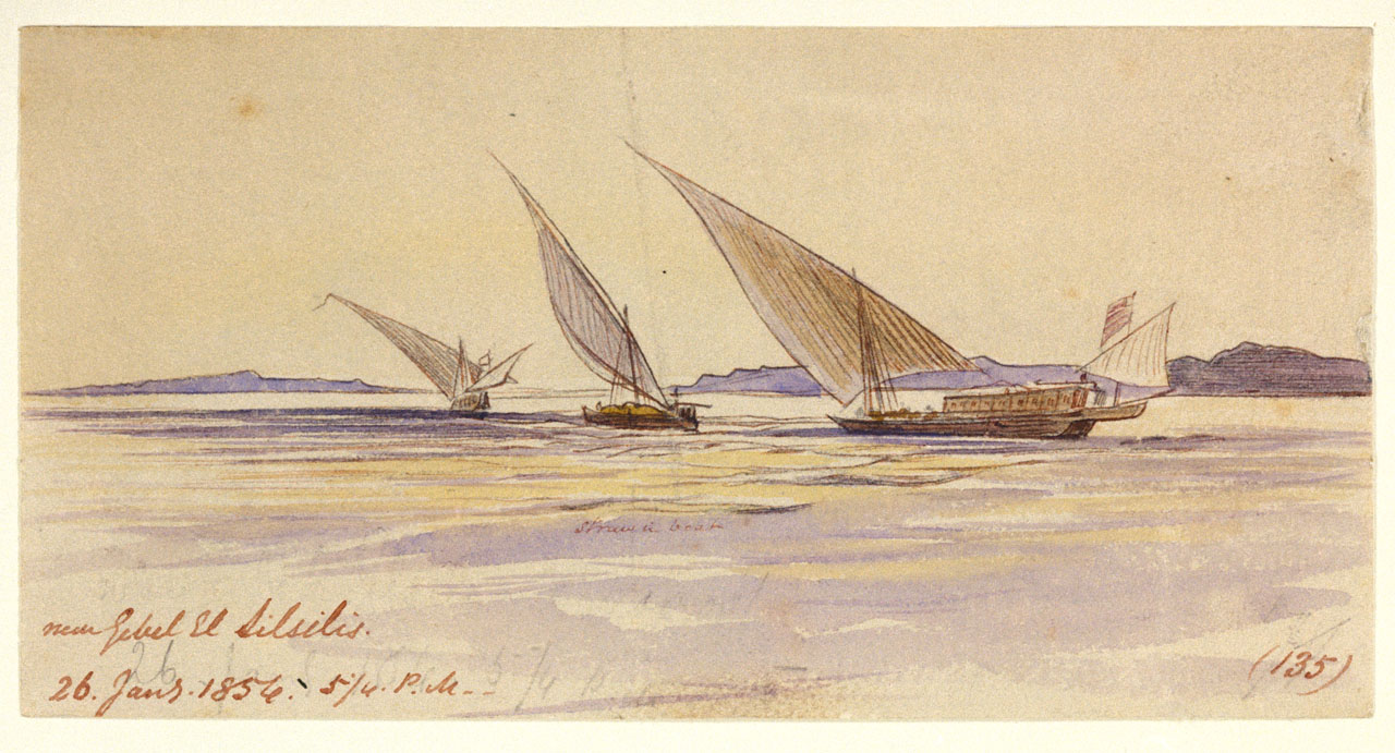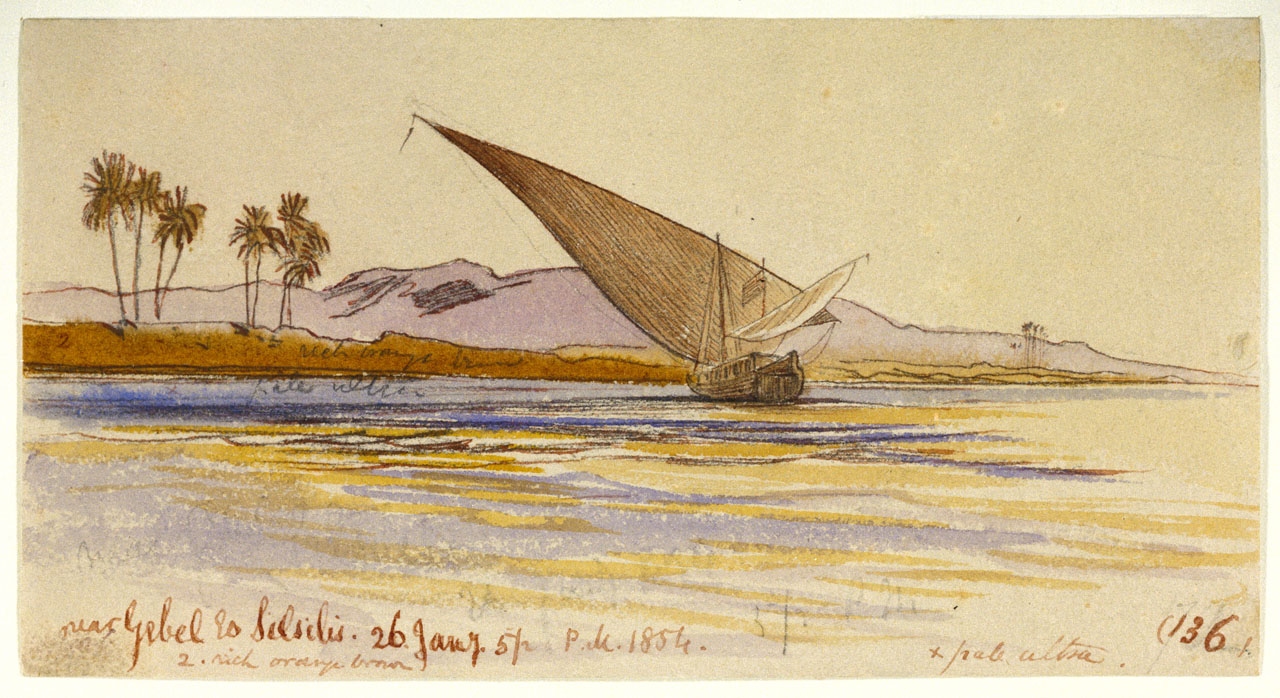 'Near Gebel El Silsilis. 26 Jany 1854. 5 1/4 A.M. (135)'. This watercolour by Edward Lear, executed on 26 January 1854 at 5:15 in the afternoon, shows shipping on the vast expanse of the Nile with three traditional Egyptian cargo vessels sailing