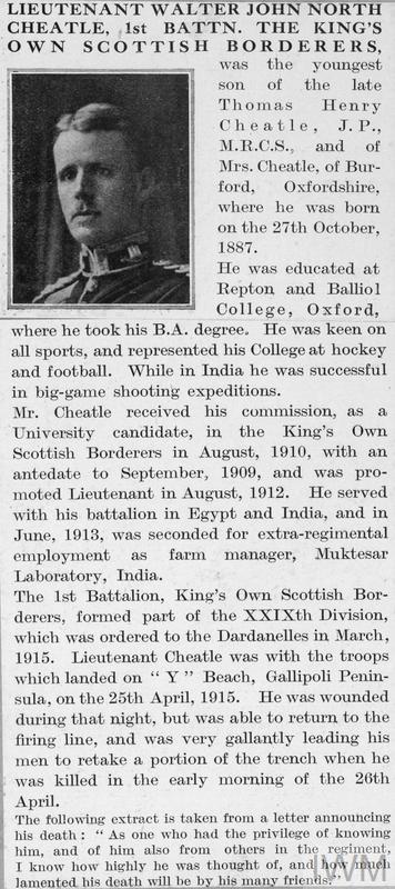 Lieutenant Walter John North Cheatle. Unit: 1st Battalion, King's Own Scottish Borderers. Death: 26 April 1915 Killed in action Gallipoli. Son of Thomas Henry and Alice Cheatle, of Burford, Oxon.