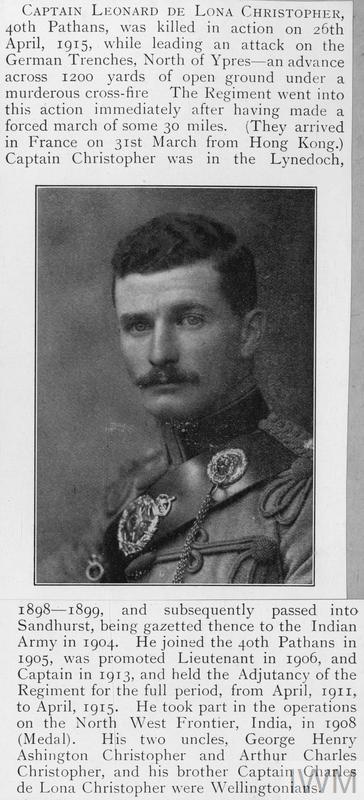 Captain Leonard De Lona Christopher. Unit: 40th Pathans, Indian Army. Death: 26 April 1915 Killed in action north of Ypres Western Front