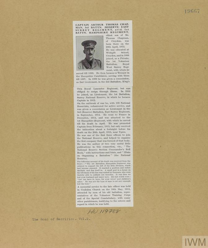 Captain Arthur Thomas Chapman. Unit: 3rd Battalion, East Surrey Regimernt, attached to 1st Battalion, Hampshire Regiment. Death: 26 April 1915 Killed in action Age 42 Western Front, Ypres