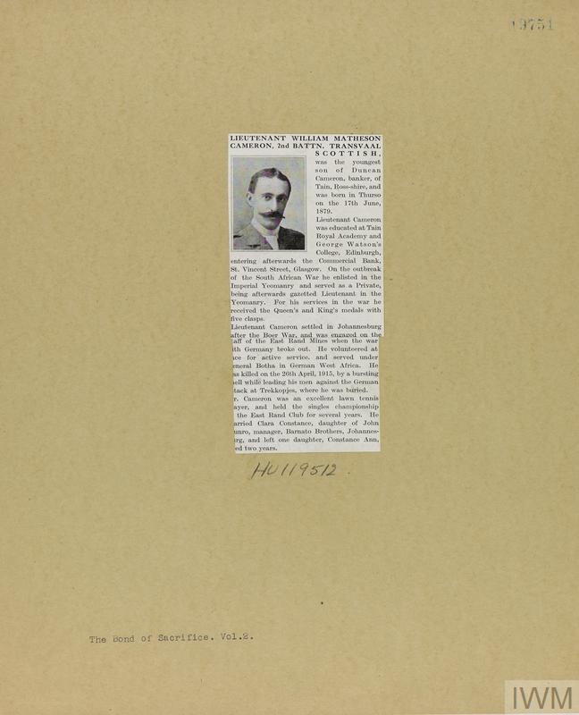 Lieutenant William Matheson Cameron. Unit: 2nd Battalion, 8th Infantry (Transvaal Scottish). Death: 26 April 1915 Killed in action at Trekkopjes West Africa
