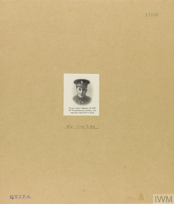 Private Arthur Irvin Bridge 2391. Unit: 1st/6th Battalion, Northumberland Fusiliers. Death: 26 April 1915 Ypres Western Front. Son of Josiah and Mary R. Bridge, of Town Hall, South Shields.