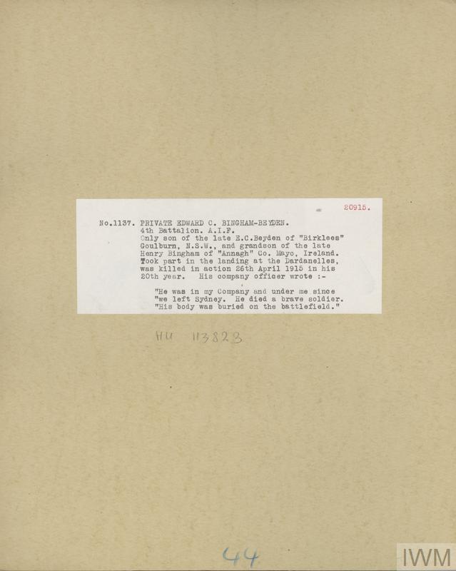 Private Edward Carruthers Bingham Bryden 1137. Unit: 4th Battalion, Australian Imperial Force. Death: 26 April 1915 Gallipoli Dardanelles