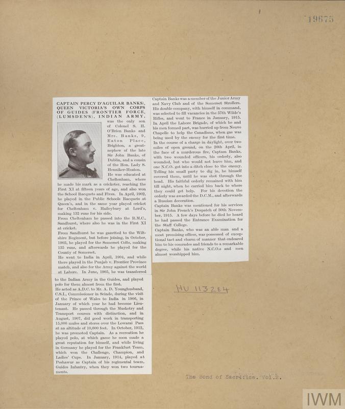 Captain Percy d'Aguilar Banks. Unit: Queen Victoria's Own Corps of Guides Infantry (Frontier Force, Lumsden's), attached to 57th Wilde's Rifles (Frontier Force), Indian Army. Death: 26 April 1915 Neuve Chapelle Western Front