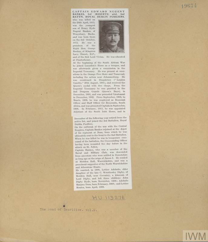 Captain Edward Nugent Bankes. Unit: 3rd (Reserve) Battalion, attached to 2nd Battalion, Royal Dublin Fusiliers. Death: 26 April 1915 St Julien Western Front