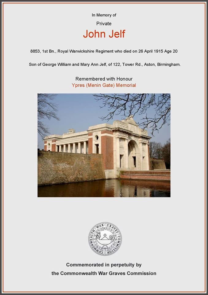 Second Lieutenant Wilfrid Mervyn Dunnington–Jefferson. Unit: 7th Battalion, attached to 3rd Battalion, Royal Fusiliers. Death: 26 April 1915 Western Front.