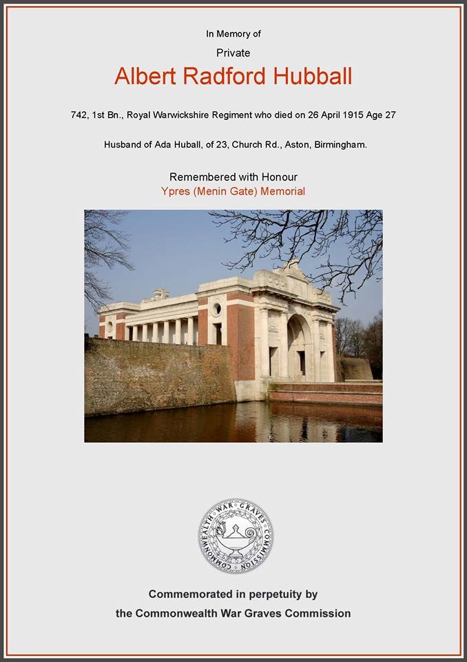 Private Albert Radford Hubball 742, Royal Warwickshire Regiment