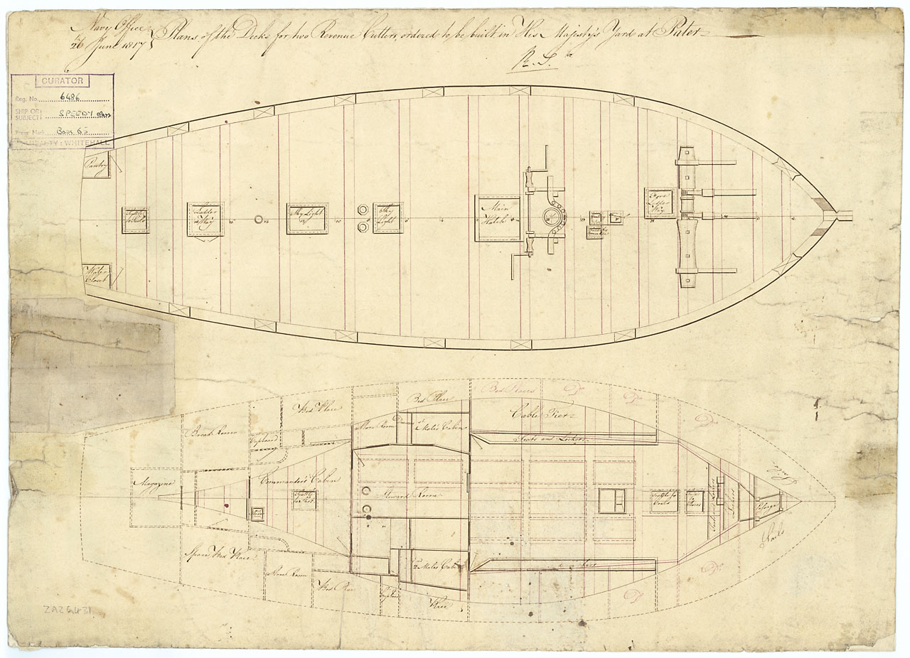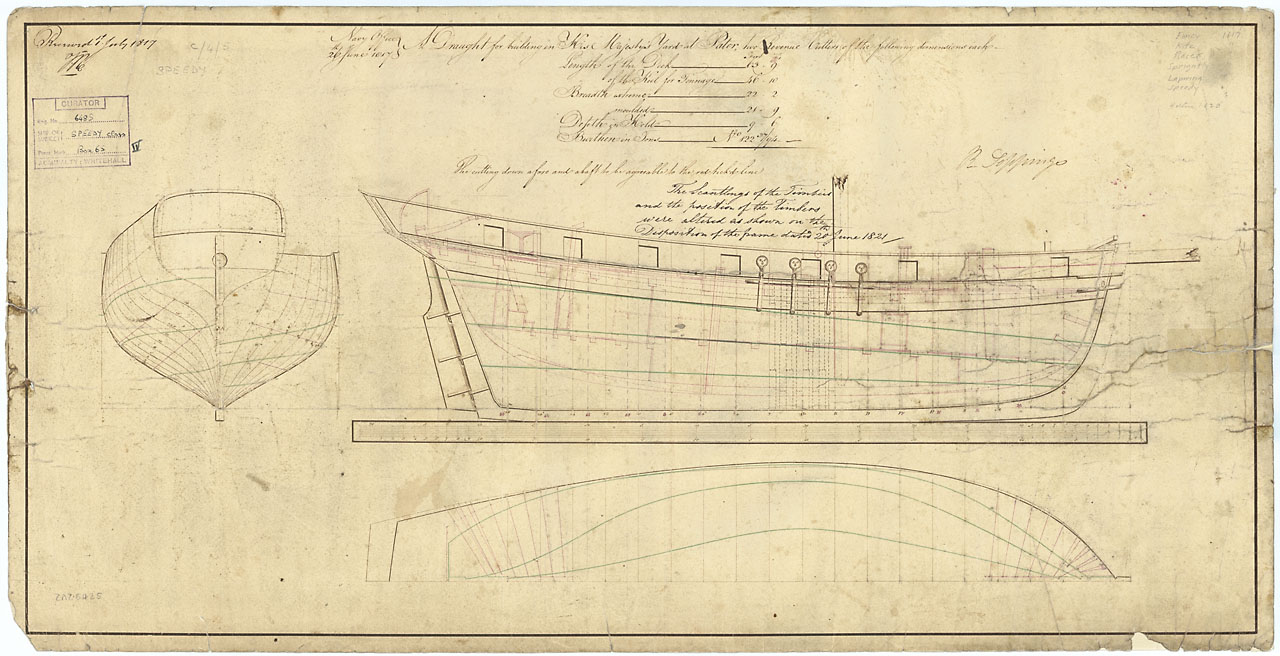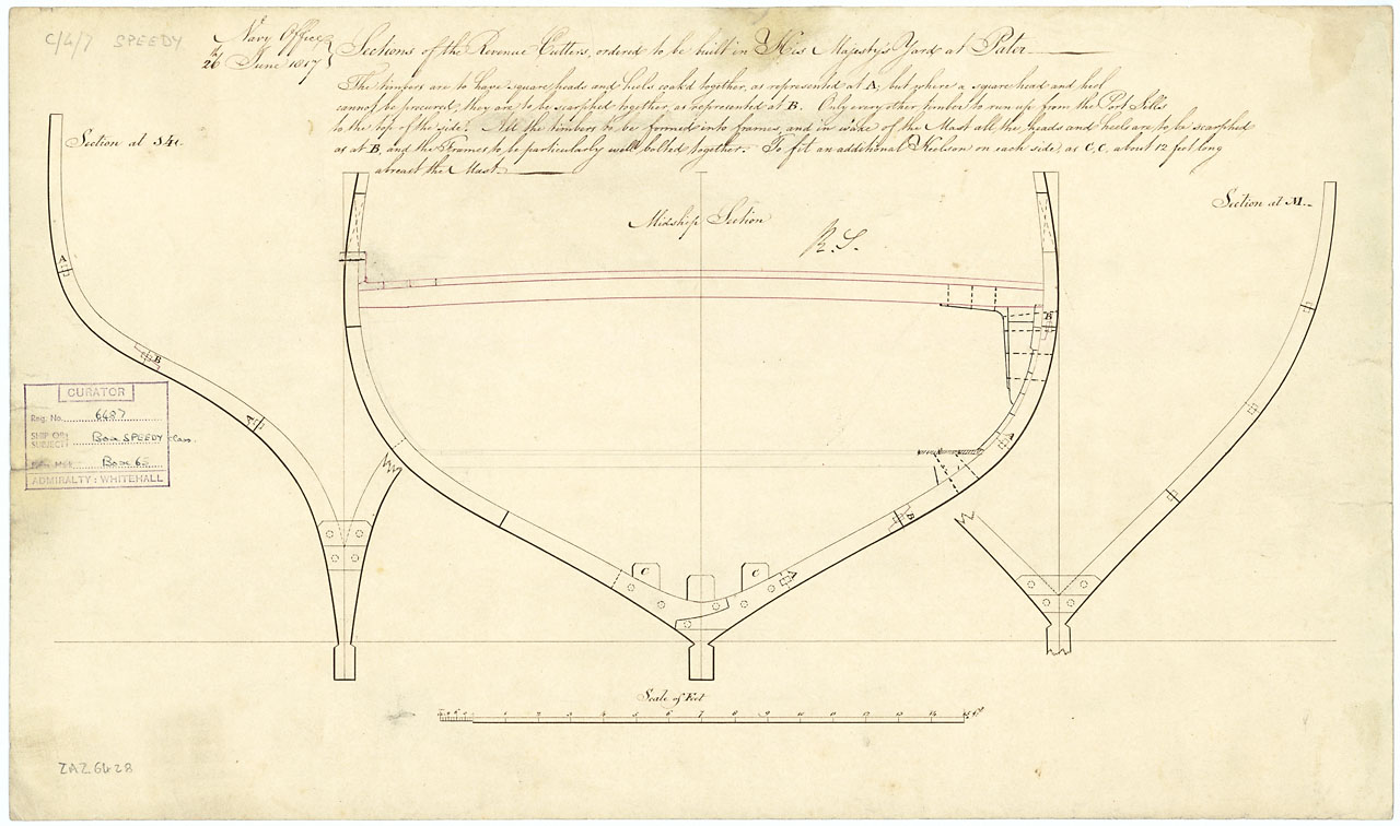 possibly Racer (1818); Sprightly (1818), and Speedy (1828) and Snipe (1828). Scale: 1:48. Plan showing the body plan with stern board outline, sheer lines with inboard detail and midship framing, and longitudinal half-breadth for Revenue Cutters to be b