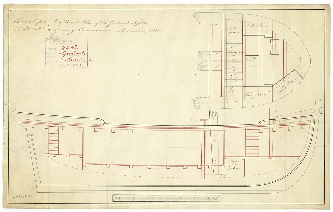 Goodwill (1810). Scale: 1:48. Plan showing the inboard profile, and deck plan forward of the mast illustrating the store rooms and platform for Goodwill (1810), a sailing Lighter for Chatham as fitted at Sheerness Dockyard.